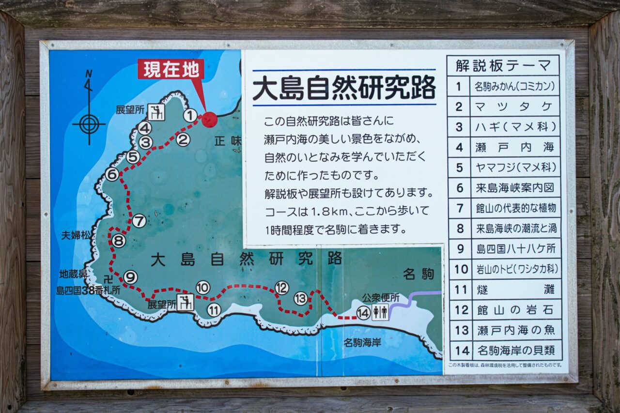 大島自然研究路は大島の南西に位置していて、行き止まりの集落「吉海町正味」と「吉海町名駒」に出入り口があります。