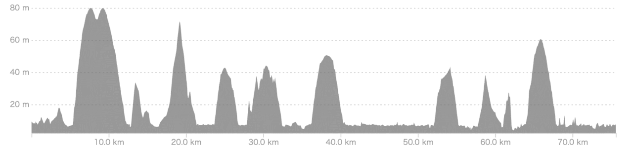 こちらはしまなみ海道を今治→尾道へ縦走する約75kmコースの高低差です。その獲得標高は約500m。