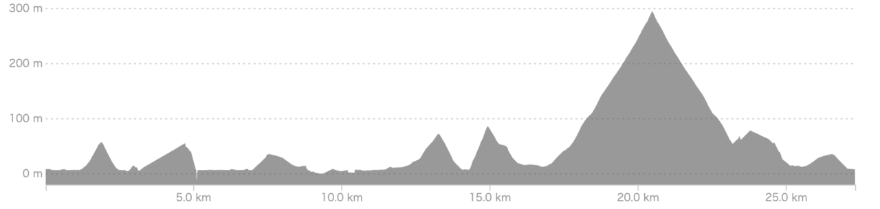 そしてこちらが今回のコースの高低差です。約27kmで獲得標高約700m