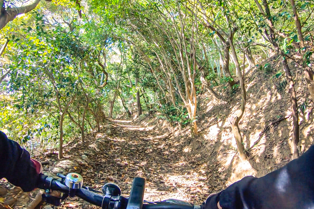 ちなみに島内は、船員さんから「島の中は自転車に乗る所はほとんど無い」としきりに言われる通り、道は落ち葉や枝が積もり、猪が掘り起こしたのであろう部分は土がボコボコで荒れ放題。