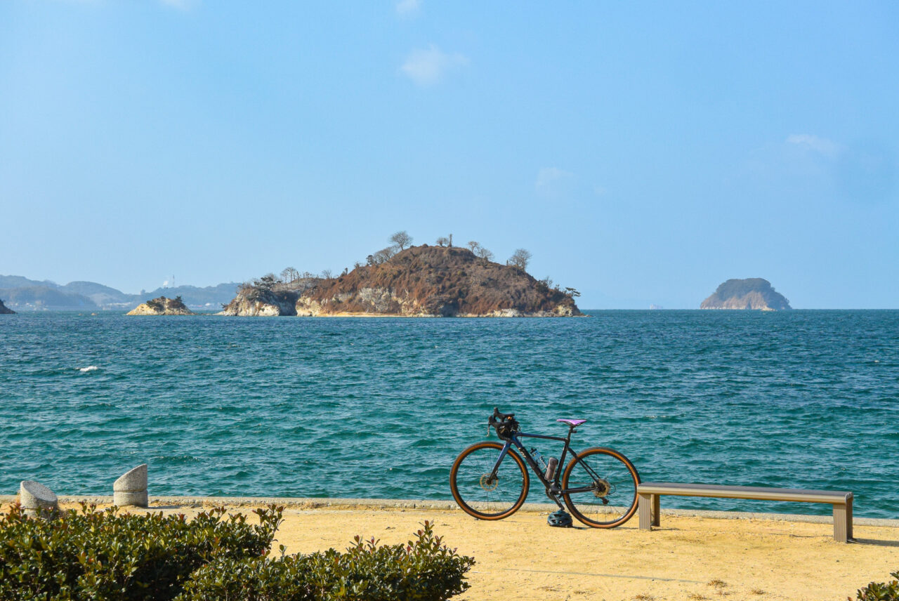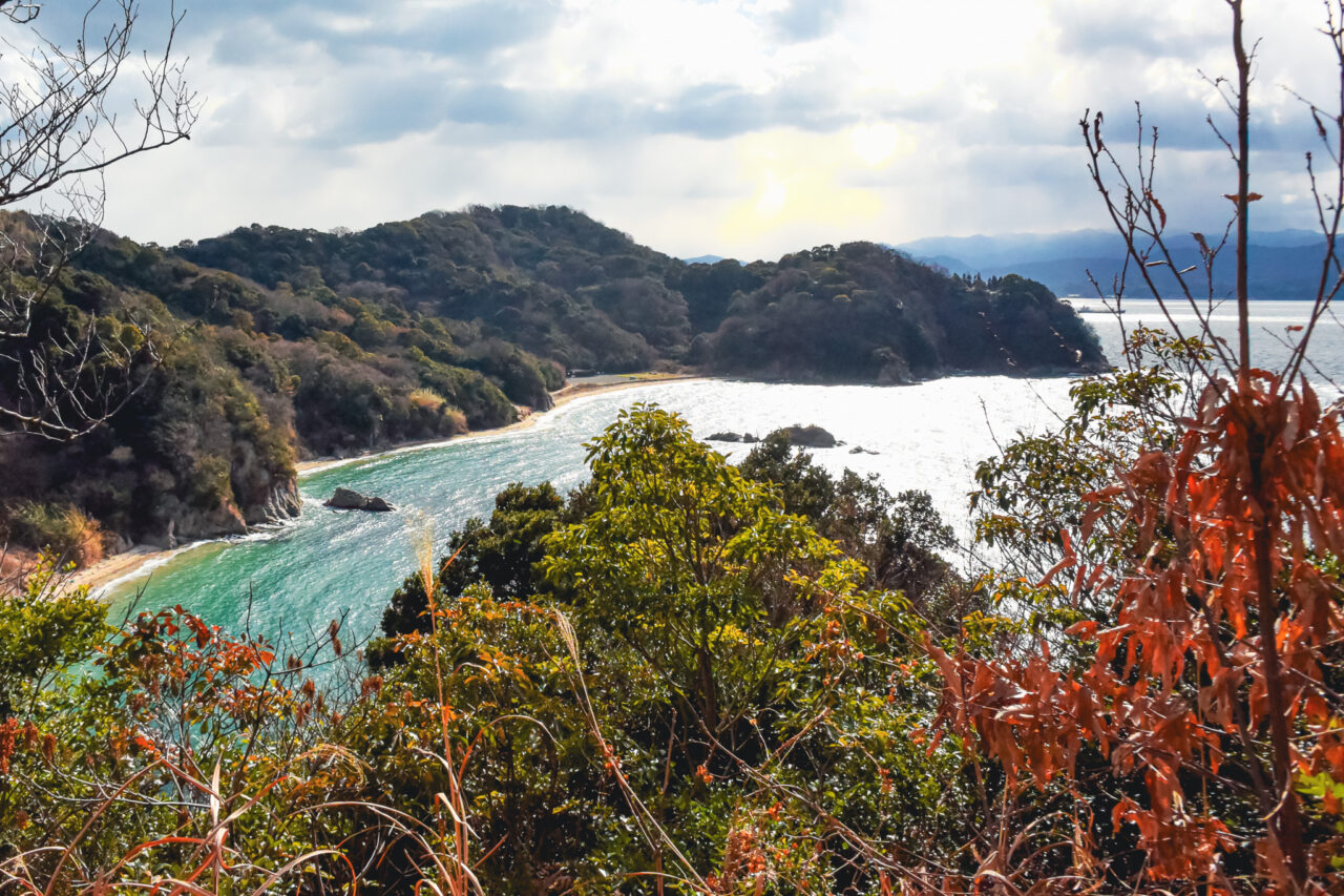 高縄半島の最西端にある場所で、近くには美しい入江が広がる無料のキャンプ場「七五三ヶ浦公園」や、この日2基目の海中鳥居「御崎神社の鳥居」、樹齢数百年を経た山桃がアーチ型に群生する「ヤマモモのこみち」など見どころいっぱいの半島です。