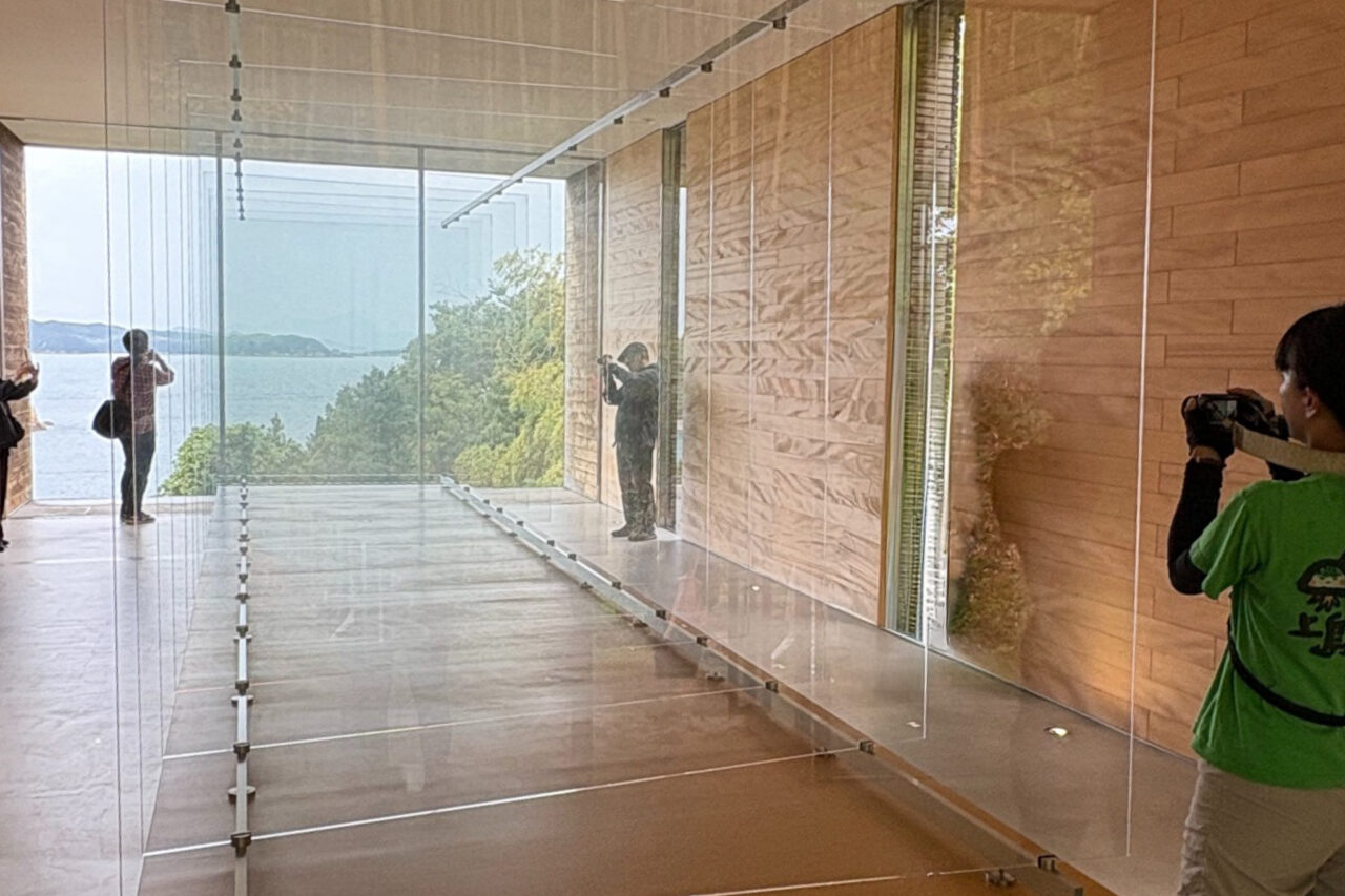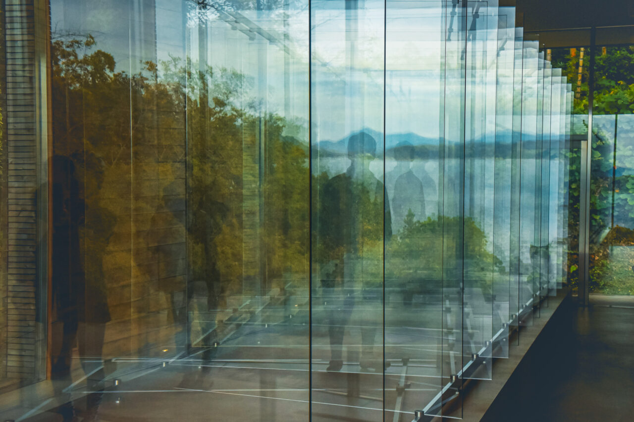こちらが目的のアート、ゲルハルト・リヒター作『14枚のガラス』です。名前の通り、14枚のガラスが角度を変えて設置されており、海側に設置された窓から差し込む光や見る角度、時間帯によって色んな姿を見せてくれます。