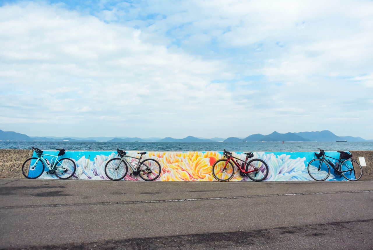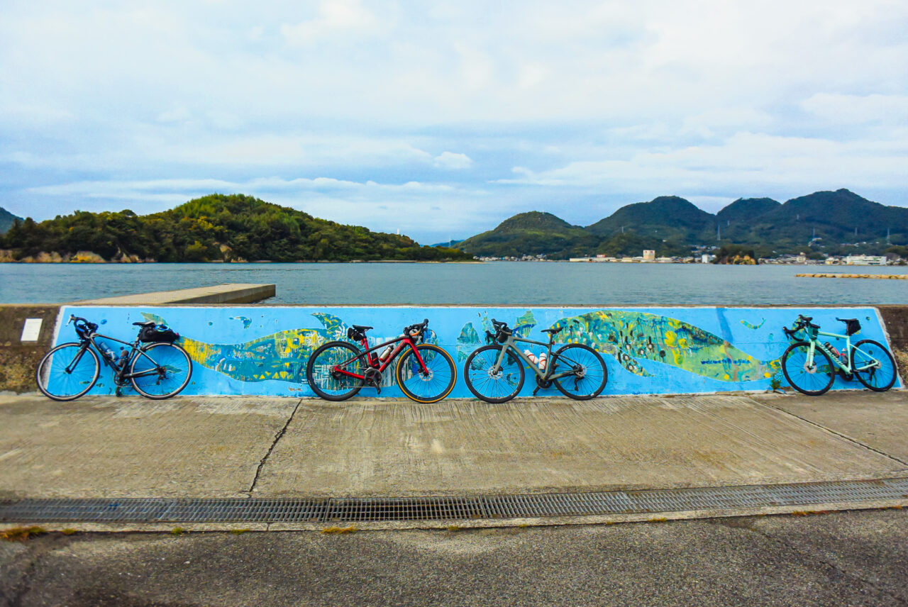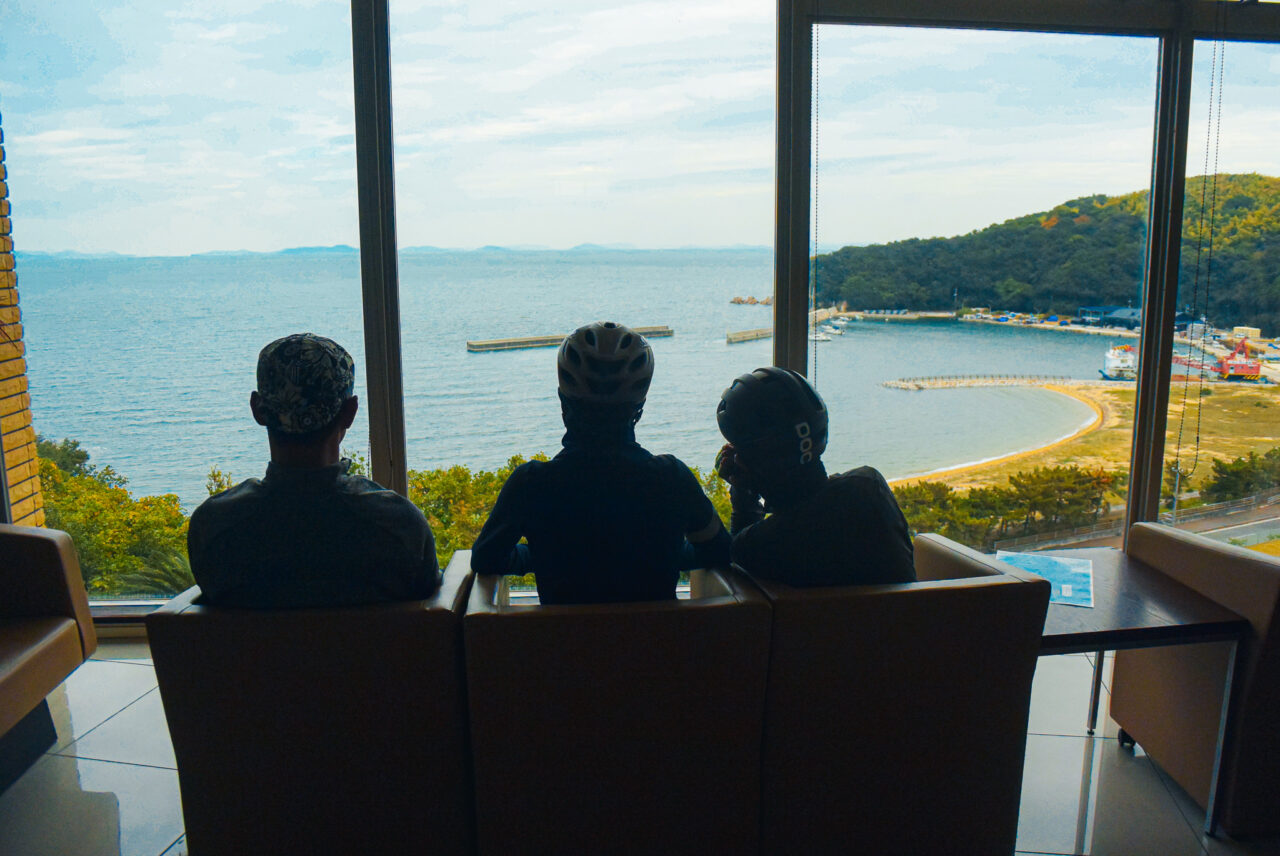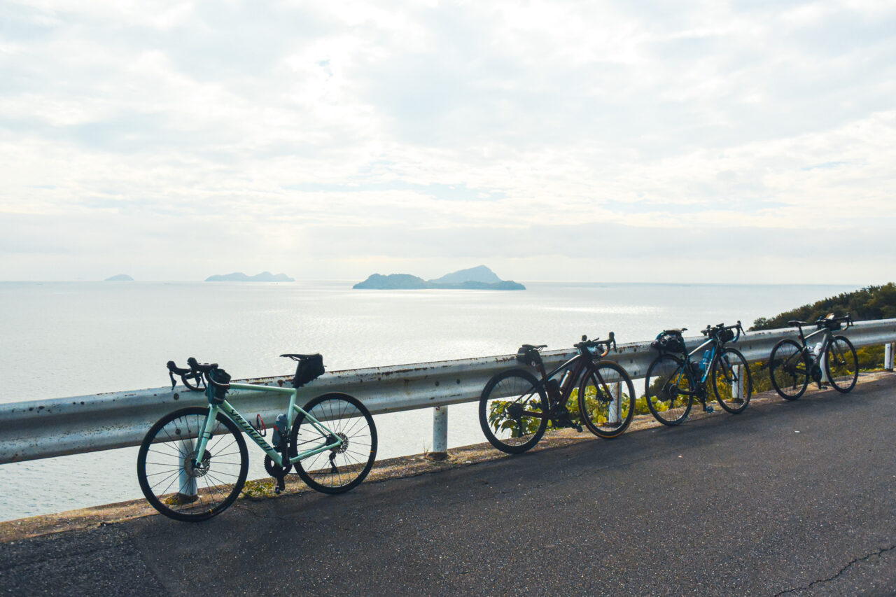 弓削島の外周道路はアップダウンの続くハードなルートですが、頑張って登った先には大海原が待ってます!(天気がイマイチなのはご愛嬌)お腹も程よく空いてきたところで、ランチスポットへ向かいます。