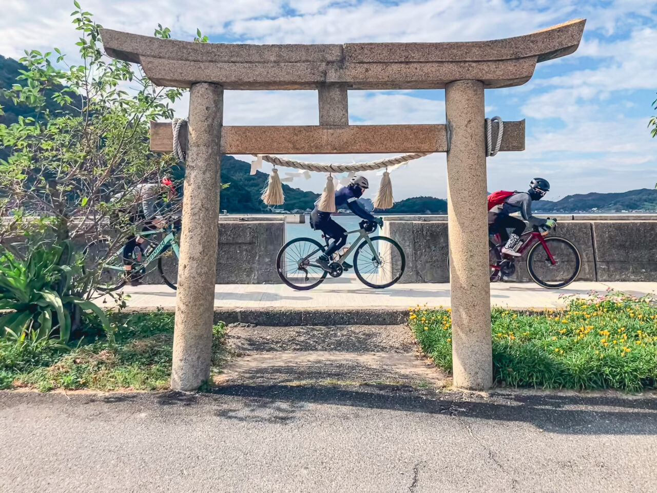 そうなれば当初の予定通り、ゆめしま海道のアート巡りへ!まずは弓削島の北部にある大森神社の鳥居で記念撮影。その近くにあるのが、